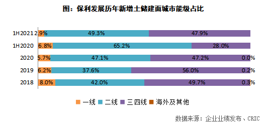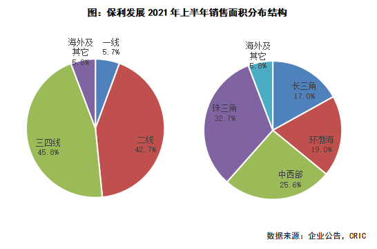 從城市布局來(lái)看,保利上半年減少了集中供地城市的拿地,重點(diǎn)22城的拿地建面占比同比下降了20個(gè)百分點(diǎn)至34%,將投資重點(diǎn)在三四線(xiàn),三四線(xiàn)新增容積率面積同比增長(zhǎng)了113.7%,占比達(dá)到47.9%,增幅有19.9個(gè)百分點(diǎn),其中,珠三角區(qū)域的茂名、佛山、汕尾、清遠(yuǎn)位居拿地建面TOP10城市。三四線(xiàn)城市拿地占比的提升,也使得保利2021年上半年的拿地均價(jià)同比下降了30.0%至5833元/平方米。
