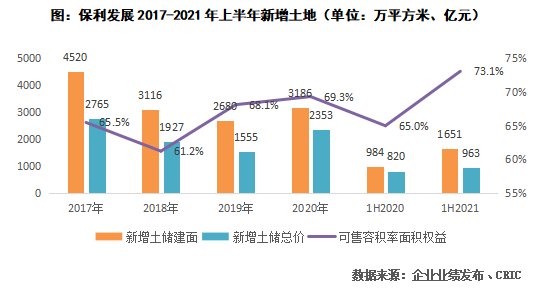 2021年上半年保利發(fā)展新增項(xiàng)目84個(gè),新增計(jì)容建筑面積達(dá)到1651萬(wàn)平方米,拓展成本963億元,分別同比增長(zhǎng)67.8%和17.4%,金額比為0.34,高于TOP10房企的0.30,拿地銷(xiāo)售面積比達(dá)到0.99。