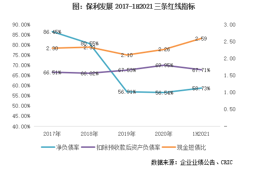 從債務(wù)結(jié)構(gòu)來(lái)看,現(xiàn)金短債比2.59,長(zhǎng)短債比4.56,分別較2020年末增加0.33和 0.96,債務(wù)結(jié)構(gòu)持續(xù)優(yōu)化;現(xiàn)金覆蓋短債,債務(wù)結(jié)構(gòu)穩(wěn)定健康。2021上半年末保利有息債同比增加378億元,凈負(fù)債率增2.18個(gè)百分點(diǎn)至58.73%,若將永續(xù)債計(jì)做負(fù)債,則凈負(fù)債上升0.64個(gè)百分點(diǎn)至70.00%,扣除預(yù)收后的資產(chǎn)負(fù)債率67.71%,較期初下降2.24個(gè)百分點(diǎn)。