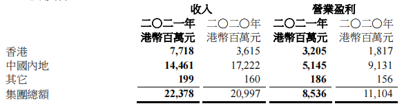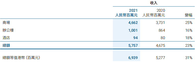 2021年集團(tuán)中國(guó)內(nèi)地投資物業(yè)組合的租金收入總額增加24%至港幣35.61億元,主要反映零售銷售額上升及人民幣升值。