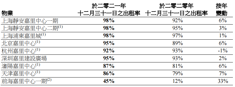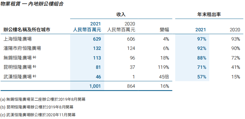 辦公樓組合方面,占內(nèi)地物業(yè)租賃收入總額的17%。2019和2020年開(kāi)業(yè)的三座新辦公樓租出率持續(xù)上升,令辦公樓的總收入錄得16%的升幅。