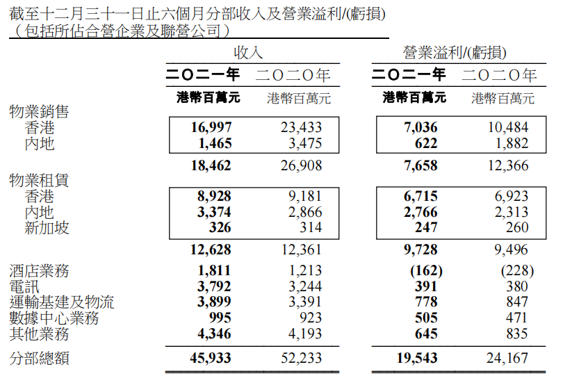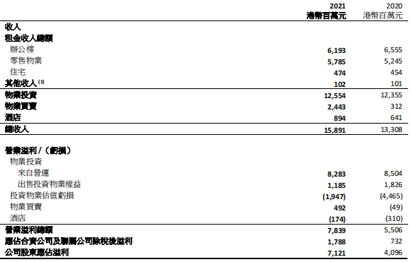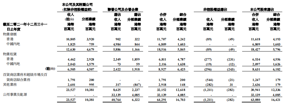 截至2021年12月31日止六個(gè)月,該集團(tuán)實(shí)現(xiàn)營(yíng)業(yè)收入401.53億港元,比下降12.84%??傋饨鹗杖氚ㄋ己蠣I(yíng)企業(yè)和聯(lián)營(yíng)公司的租金收入按年上升2%至港幣126.28億元,凈租金收入按年上升2%至港幣97.28億元。