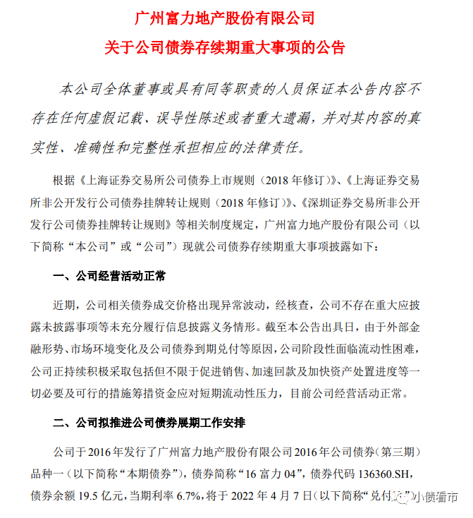據了解,“16富力04”將于2022年4月7日到期兌付,但富力地產預計無法籌措到足額兌付資金,擬與債券持有人溝通債券展期事宜。