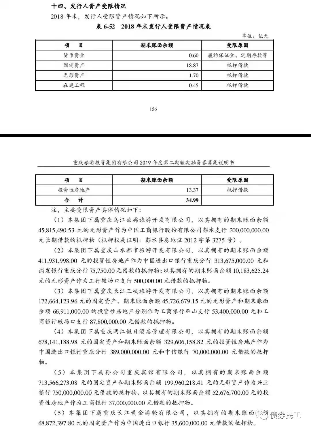 1、由于“20重慶旅投GN001”為PPN,發(fā)行材料不公開。債券民工從公開渠道找到了重慶旅投2019年度第二期短期融資券募集說明書作為參考,其中募集說明書對(duì)于受限資產(chǎn)部分的描述很簡單,按照會(huì)計(jì)科目對(duì)受限資產(chǎn)的內(nèi)容進(jìn)行了簡要介紹。