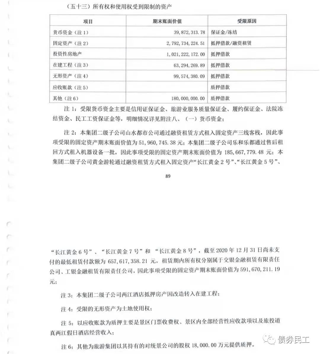 2、從重慶旅投公布的2020年審計(jì)報(bào)告來看,對(duì)于受限資產(chǎn)的描述同樣是按照會(huì)計(jì)科目進(jìn)行的,在表格下進(jìn)行了對(duì)受限資產(chǎn)進(jìn)行了簡要的匯總描述,沒有針對(duì)每筆首先資產(chǎn)的情況進(jìn)行介紹。