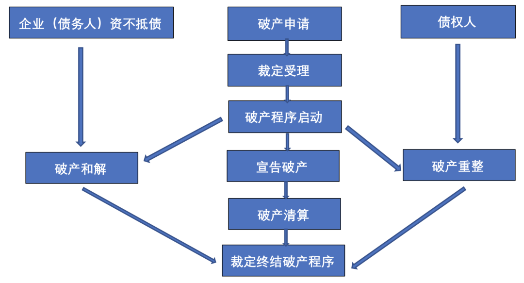廣義上的企業(yè)破產(chǎn)程序包括清算、重整與和解程序。當(dāng)企業(yè)不能清償?shù)狡趥鶆?wù),資產(chǎn)不足以清償全部債務(wù)或喪失清償能力時(shí),則企業(yè)可以根據(jù)不同情況進(jìn)入不同的破產(chǎn)程序,其法律流程如下圖所示: