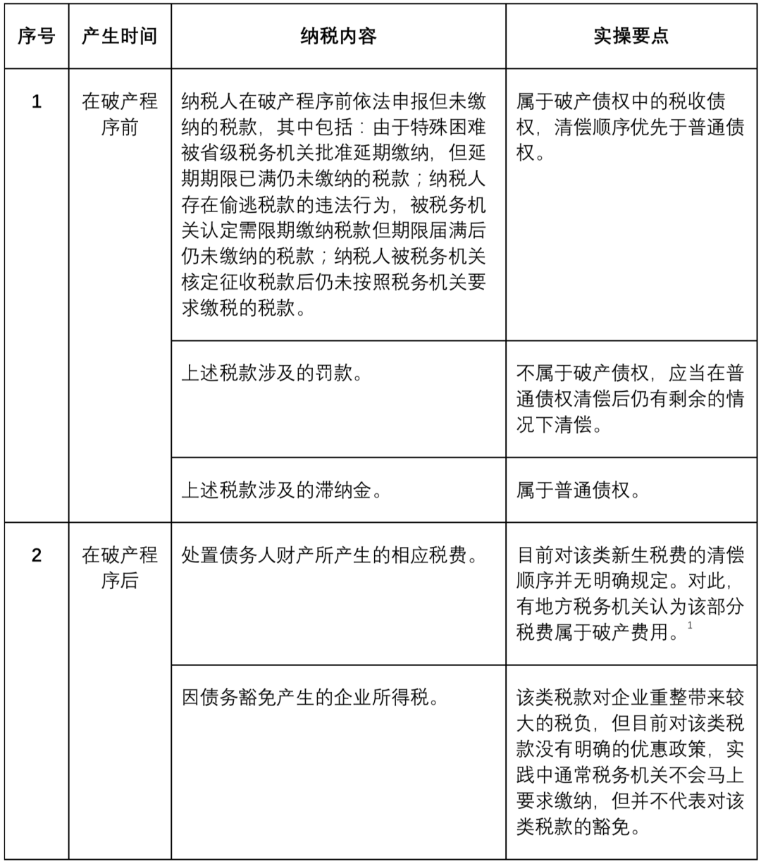 而對(duì)于作為債務(wù)人的破產(chǎn)企業(yè)而言,其涉稅內(nèi)容在破產(chǎn)法項(xiàng)下有特別的規(guī)定與要點(diǎn),由于債務(wù)人所需承擔(dān)稅負(fù)直接影響到破產(chǎn)財(cái)產(chǎn)的分配情況,或是重整計(jì)劃/和解協(xié)議的執(zhí)行,對(duì)債權(quán)人而言十分重要,因此筆者作了如下梳理(表一):