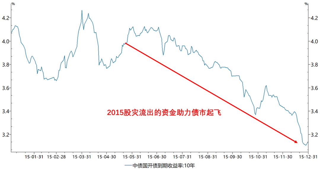 2015股市的大跌使得資金迅速投向固收市場避險,股債蹺蹺板效應明顯。在股市流出資金的帶動下,債券市場結束調整,10年期國開債迎來了一波100bp的大牛市。