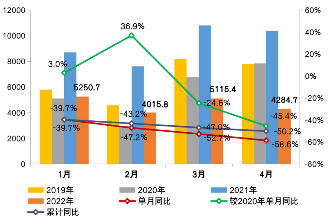 2022年以來,中國房地產行業下行壓力持續、市場整體表現保持低迷,疊加部分城市受疫情封控影響,4月百強房企銷售規模大降。