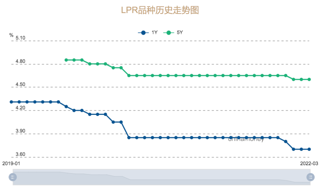 在此之后,2022年至今5年期LPR一直保持較低水平。2022年3月21日,最新公布的LPR數(shù)據(jù)顯示,2022年3月1年期LPR和5年期LPR與上個(gè)月持平,分別為3.7%和4.6%。