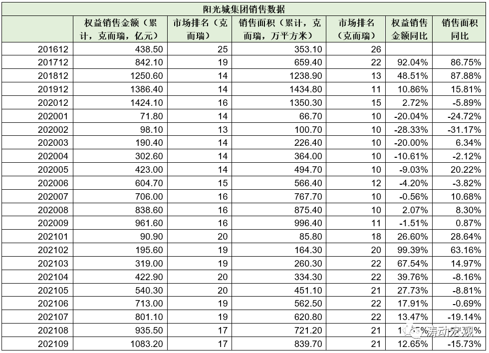 2、2016年以來,陽光城的銷售情況有了質(zhì)的飛躍,具體看2016年權益銷售金額僅為438.50億元(排名全國第25位),2017年權益銷售金額達到842.10億元(排名全國第19位)、2018年直接躍升至1250.60億元(排名全國第14位),2019-2020年的權益銷售金額則分別為1386.40億元和1424.10億元。數(shù)據(jù)上也能看出,2019-2021年陽光城的銷售增長有所放緩。