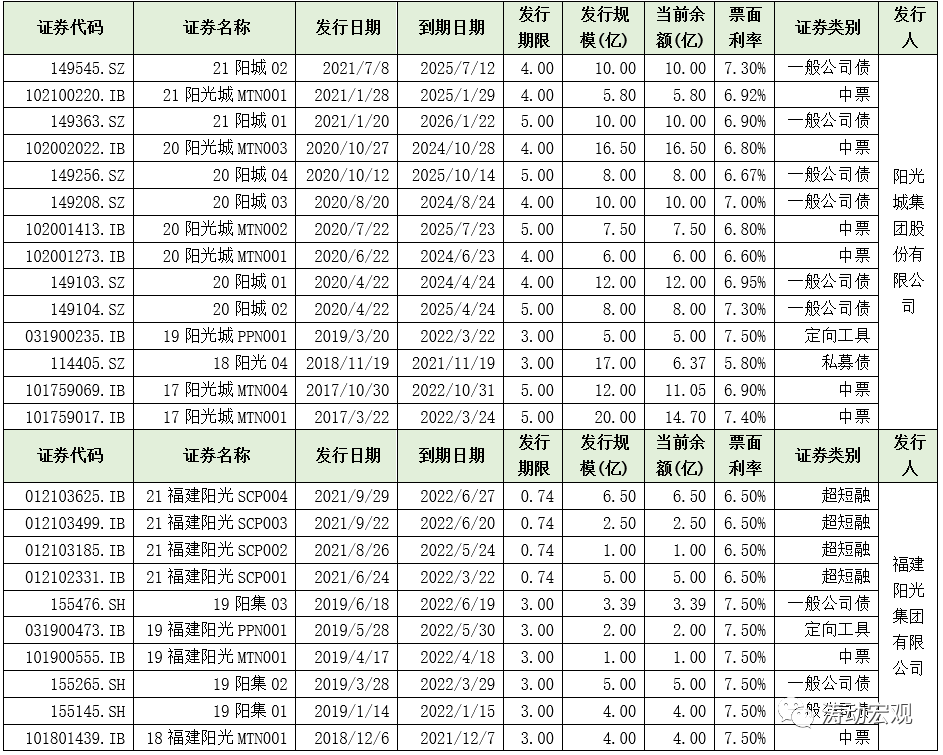 (1)除八只美元債和七只ABS外,陽光城體系目前還有24只存量境內(nèi)債券,余額合計為165.31億元。其中,陽光城集團有14只存量債券(余額合計為130.92億元)、福建陽光集團有10只存量債券(余額合計為34.39億元)。