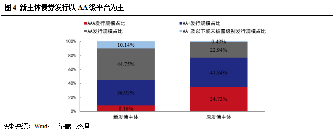 新主體中部分為已發債企業的母公司,此類新主體高級別平臺占比較高,較多主體進行了資產整合,級別相對子公司有所提升,融資成本有所下降;同時也有較多的新主體為已發債企業子公司,此類新主體以AA級平臺為主,大部分主體相比于母公司級別更低,且使用增信的債券發行規模占比高,但相比于母公司發債的融資成本仍較高