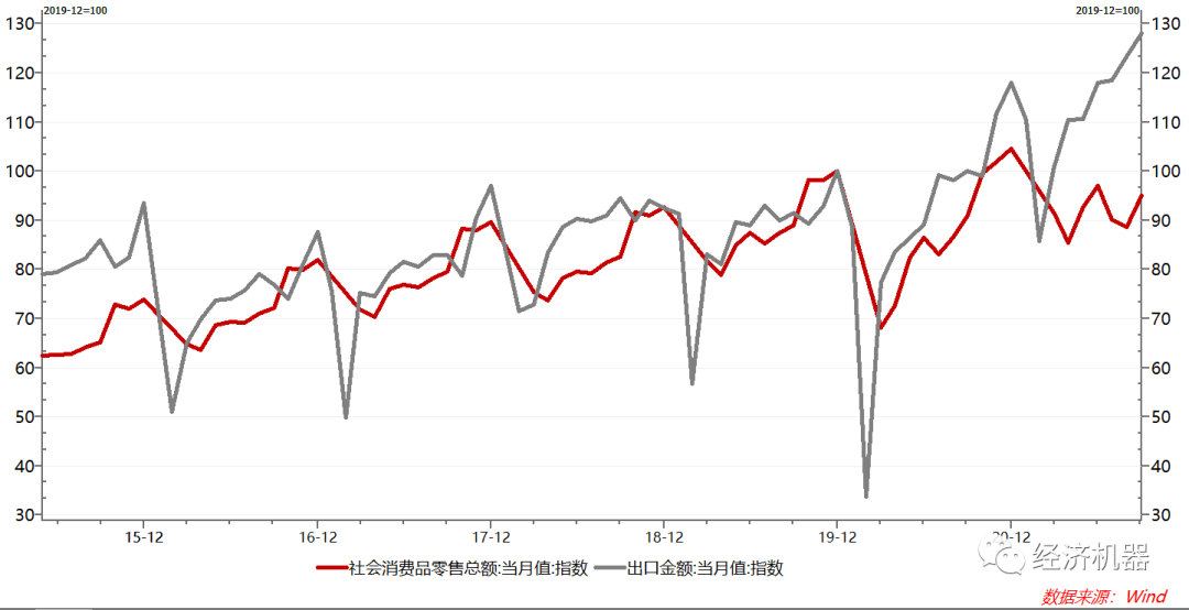 圖8:消費(fèi)復(fù)蘇遠(yuǎn)遠(yuǎn)落戶于出口復(fù)蘇,且復(fù)蘇近期中止