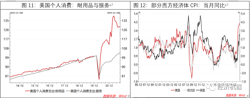 • 海外需求沖擊帶來的輸入性通脹。疫情期間,以美國為首的西方國家推出了大力度的財(cái)政刺激措施,包括向民眾派發(fā)現(xiàn)金,導(dǎo)致居民儲蓄率和購買力大幅提高。隨著疫苗接種,需求領(lǐng)先于供給而恢復(fù),耐用消費(fèi)品需求更是出現(xiàn)“井噴”,速度遠(yuǎn)快于服務(wù)消費(fèi)(圖11),加劇了其國內(nèi)的大通脹(圖12)。由于耐用品多屬于貿(mào)易品,通過國際貿(mào)易形式,向我國輸入了通脹壓力。