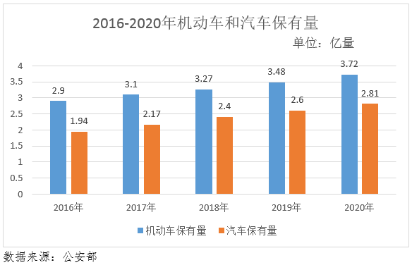 公安部統計數據顯示,2020年全國機動車保有量達3.72億量,其中汽車2.81億量。2020年全國新注冊登記機動車3328萬輛,新領證駕駛人2231萬人。