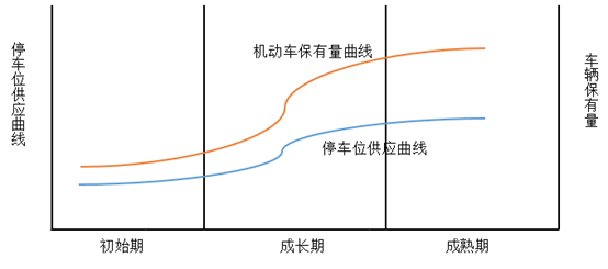 居民消費水平的提高拉動了汽車消費,而汽車保有量的持續提高促進了停車設施需求的擴大。機動車保有量與停車泊位在不同發展時期的關系如下圖所示: