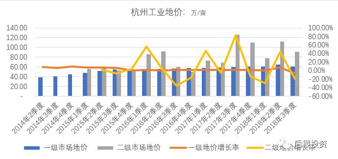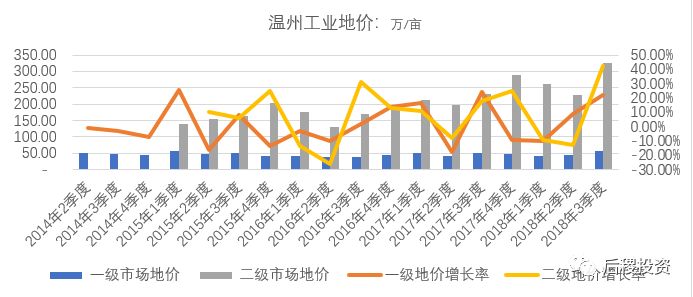 我們挑選杭州、寧波、溫州這三個比較典型城市,統計了自2014-2018年工業土地司法拍賣與一級出讓的價格變化趨勢: