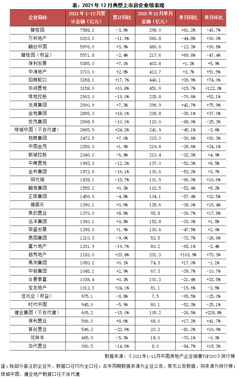 2021年12月,TOP100房企實現銷售操盤金額9940.1億元,單月業績規模較上月環比增長32.4%,同比降低35.2%。從全年來看,2021年百強房企呈現先揚后抑的走勢,二季度特別是下半年之后市場降溫明顯,百強房企單月業績增速由正轉負且降幅不斷擴大。截至12月末累計銷售操盤金額較2020年同比降低3.5%,規模房企銷售增速罕見出現負增長。