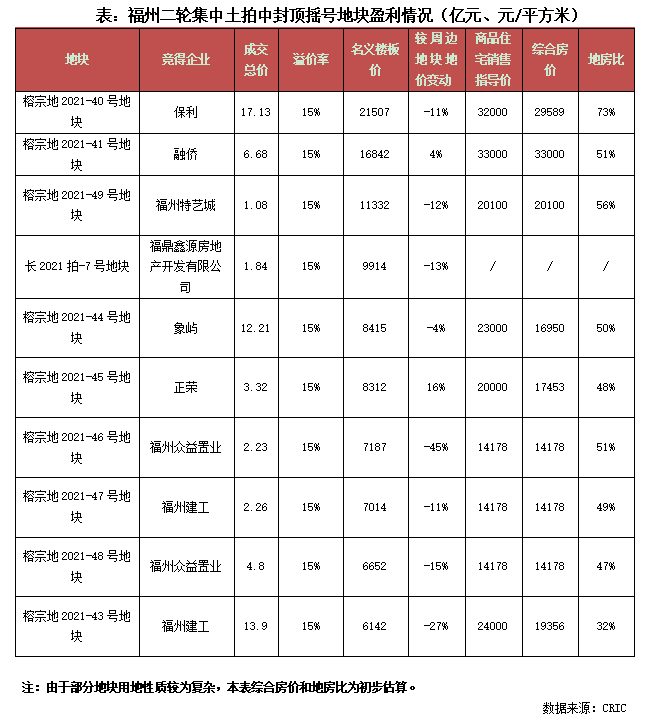 盡管多宗地塊封頂搖號(hào)成交,但受“最高限價(jià)下調(diào)+取消競(jìng)配建”的影響,福州二輪集中出讓中多數(shù)地塊的地房比都保持在合理范圍內(nèi),也為房企預(yù)留了較為充足的利潤(rùn)空間。結(jié)合近期政策環(huán)境來(lái)看,福州第二輪集中土拍“降溫”將不是個(gè)例。
