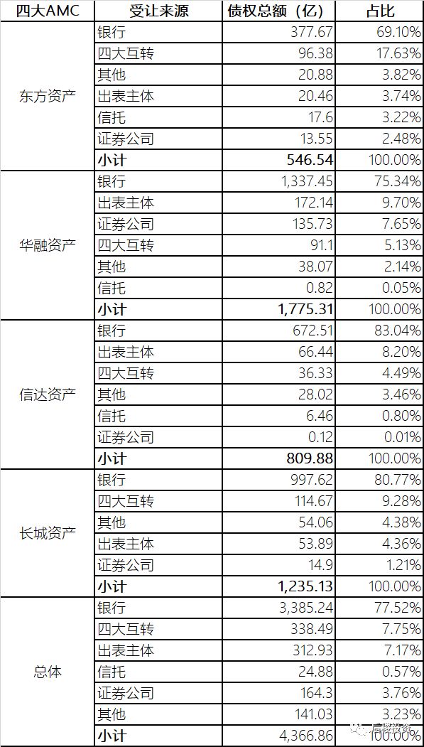 按2018年銀行出讓了4500億債權計,四大AMC從銀行共受讓了3385億,市場占比為75.2%。此外,四大間相互轉讓、銀行常用出表通道再次轉讓給四大的情況也不少見。