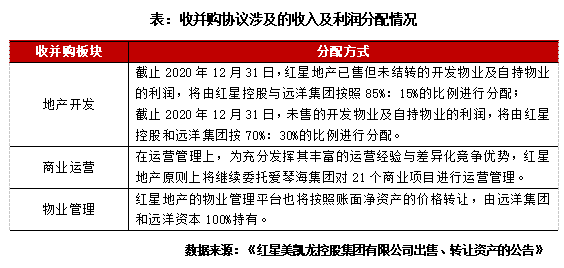 21個商業(yè)并入,遠(yuǎn)洋集團(tuán)商業(yè)版圖擴(kuò)大。紅星地產(chǎn)還擁有21個知名的商業(yè)項目,根據(jù)收購框架協(xié)議,紅星地產(chǎn)持有的商場和商業(yè)街,原則上仍委托紅星控股指定服務(wù)提供商運(yùn)營,也就是說將繼續(xù)委托愛琴海集團(tuán)對21個商業(yè)項目進(jìn)行運(yùn)營管理。目前,商業(yè)項目已有3家處于開業(yè)狀態(tài),預(yù)計今明兩年新增開業(yè)數(shù)量十余個,項目超30%位于華東區(qū)域。截至2020年底,遠(yuǎn)洋集團(tuán)共持有18個經(jīng)營中的投資物業(yè),主要為寫字樓項目,多位于北京及環(huán)渤海區(qū)域,此次股權(quán)合作也是對遠(yuǎn)洋商業(yè)版圖的擴(kuò)充。遠(yuǎn)洋集團(tuán)物業(yè)服務(wù)方面也將進(jìn)一步優(yōu)化。紅星地產(chǎn)的物業(yè)管理平臺也將按照賬面凈資產(chǎn)的價格轉(zhuǎn)讓,由遠(yuǎn)洋集團(tuán)和遠(yuǎn)洋資本100%持有。未來3年內(nèi),隨著項目進(jìn)入交付期,該紅星物業(yè)管理平臺在管面積有望突破2,000萬平方米。同時遠(yuǎn)洋集團(tuán)旗下遠(yuǎn)洋服務(wù)截至2020年末物業(yè)合約面積約為7110萬平方米,此次合作后遠(yuǎn)洋集團(tuán)將通過管理資源整合、業(yè)主增值服務(wù)的提升及經(jīng)營結(jié)構(gòu)的調(diào)整完善,不斷提升物業(yè)的資產(chǎn)和服務(wù)質(zhì)量。紅星控股推進(jìn)輕資產(chǎn)戰(zhàn)略,降負(fù)債穩(wěn)現(xiàn)金流。從紅星方面來看,本次紅星控股和遠(yuǎn)洋集團(tuán)合作,與紅星地產(chǎn)的母公司紅星美凱龍控股的債務(wù)壓力不無關(guān)系。紅星控股旗下家居品牌紅星美凱龍負(fù)債規(guī)模逐年攀升,紅星地產(chǎn)的主體紅星企發(fā)也需要母公司資金輸血。根據(jù)紅星美凱龍控股2021年度債券報告來看,企業(yè)盈利規(guī)模下降而債務(wù)壓力增加,企業(yè)2020年凈利潤29.8億元,同比下降45.1%。而企業(yè)2020年凈負(fù)債率達(dá)99.8%。長短債務(wù)比1.62,較上年下降0.36,短債比重增加;且現(xiàn)金短債比0.56,較上年下降0.07,現(xiàn)金已經(jīng)無法覆蓋短債。紅星控股欲剝離地產(chǎn)資產(chǎn)獲取穩(wěn)定現(xiàn)金流,發(fā)展家居主業(yè)。截至2020年年末紅星控股的地產(chǎn)主業(yè)占比37.89%,地產(chǎn)板塊融資難或為此次交易的原因之一。對于家居起家的紅星控股來說,其可能希望通過對地產(chǎn)板塊部分資產(chǎn)的剝離,將資源集中在原來的家居主業(yè)板塊,這對“+地產(chǎn)”的企業(yè)來說,是一次聚焦主業(yè)的回歸。本次交易完成后,將降低紅星控股有息負(fù)債水平,資產(chǎn)負(fù)債率也將會優(yōu)化,同時紅星控股仍持有紅星地產(chǎn)的利潤分配權(quán),未來將帶來持續(xù)穩(wěn)定的現(xiàn)金流。這次的遠(yuǎn)洋收購紅星,只是上半年地產(chǎn)收并購的一個縮影。在上半年的收并購案例中,有傳統(tǒng)的“大魚吃小魚”,金茂收購中國宏泰,只用了22億元,撬動8個城市運(yùn)營項目。“大魚吃大魚”也時有出現(xiàn),如融創(chuàng)收購彰泰集團(tuán),雙方成立合資公司,接手彰泰集團(tuán)所屬目標(biāo)公司100%權(quán)益,交易對價約99.1億元;市場上更有頭部房企收并購傳聞出現(xiàn)。另外近年來也有外資頻頻加碼中國房企,如黑石收購SOHO中國。