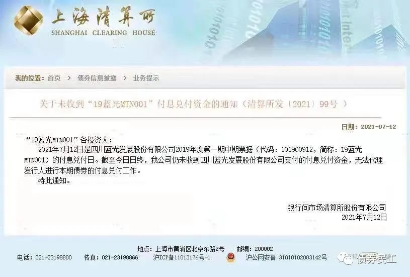 根據上海清算網2021年7月12日的公告,四川藍光發展股份有限公司(以下簡稱“藍光發展”)發行的“19藍光MTN001”未能按時支付付息兌付資金,構成了實質性債券違約。這是繼泰禾集團、華夏幸福違約之后的第三家千億房企發生債券實質性違約。
