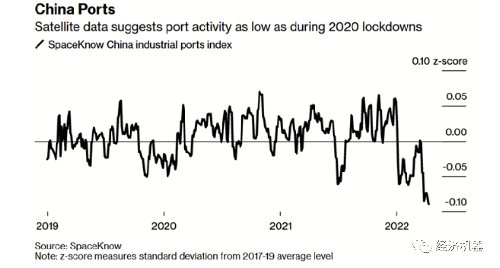 疫情再次擴(kuò)大,對(duì)出口增速放緩影響不可忽視。一方面,本輪疫情的“震中”在我國(guó)的“經(jīng)濟(jì)心臟”—上海,背靠我國(guó)乃至世界供應(yīng)鏈的中心長(zhǎng)三角經(jīng)濟(jì)帶,對(duì)外貿(mào)出口至關(guān)重要。上海作為疫情重災(zāi)區(qū),上海港的供應(yīng)鏈面臨巨大壓力。據(jù)衛(wèi)星數(shù)據(jù)顯示,此次疫情對(duì)港口物流的影響比以往更加嚴(yán)重(圖2)。