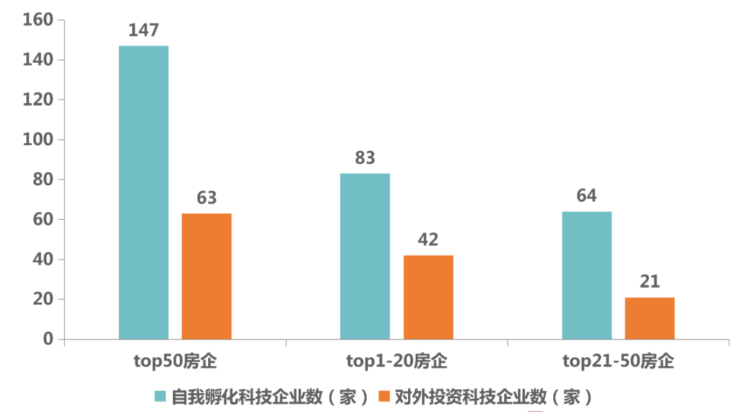 據克而瑞科創統計,TOP50房企中自我孵化科技企業數達147家,遠超過對外投資科技企業數的63家。究其原因,主要是因為自我孵化的生存壓力小,而投資科技公司會因為外部市場競爭壓力過大,存在比較大的生存風險。
