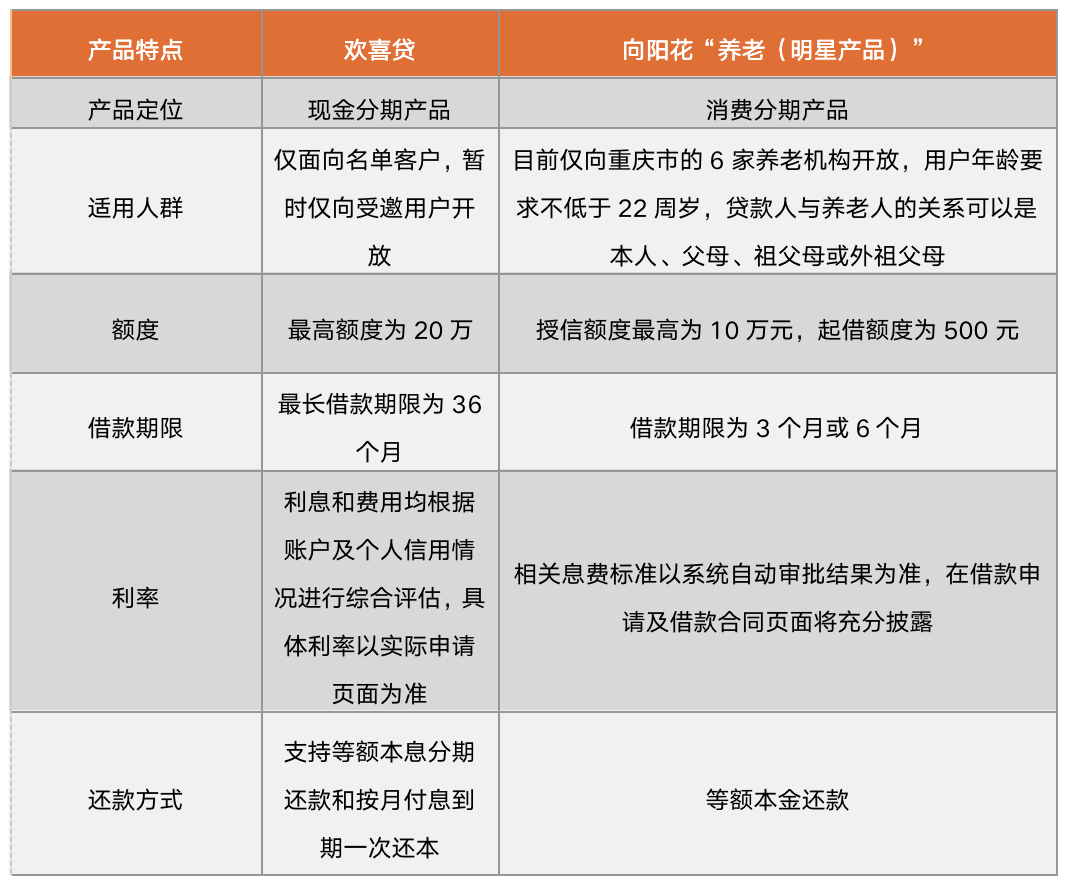 截至2021年11月,陽(yáng)光消費(fèi)金融僅有兩款產(chǎn)品:第一款是平臺(tái)開業(yè)初期便推出的現(xiàn)金分期產(chǎn)品“歡喜貸”;第二款是2021年5月推出的場(chǎng)景消費(fèi)分期產(chǎn)品“向陽(yáng)花”,該品類下還包括“養(yǎng)老(明星產(chǎn)品)”與“教育(高端晉升)”兩種產(chǎn)品。