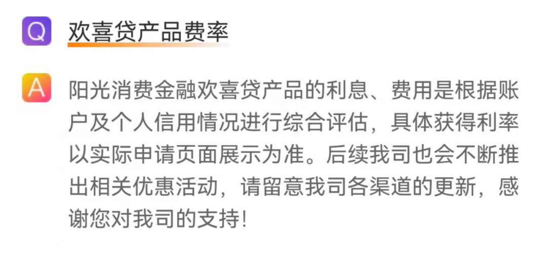此前2021年3月31日,央行發(fā)布公告要求所有貸款平臺(tái)公示利率,而陽(yáng)光消費(fèi)金融在“歡喜貸”的產(chǎn)品信息展示上,未能按要求公示利率。截至11月初,陽(yáng)光消費(fèi)金融針對(duì)該公告,仍未采取措施或做出相關(guān)回復(fù)。