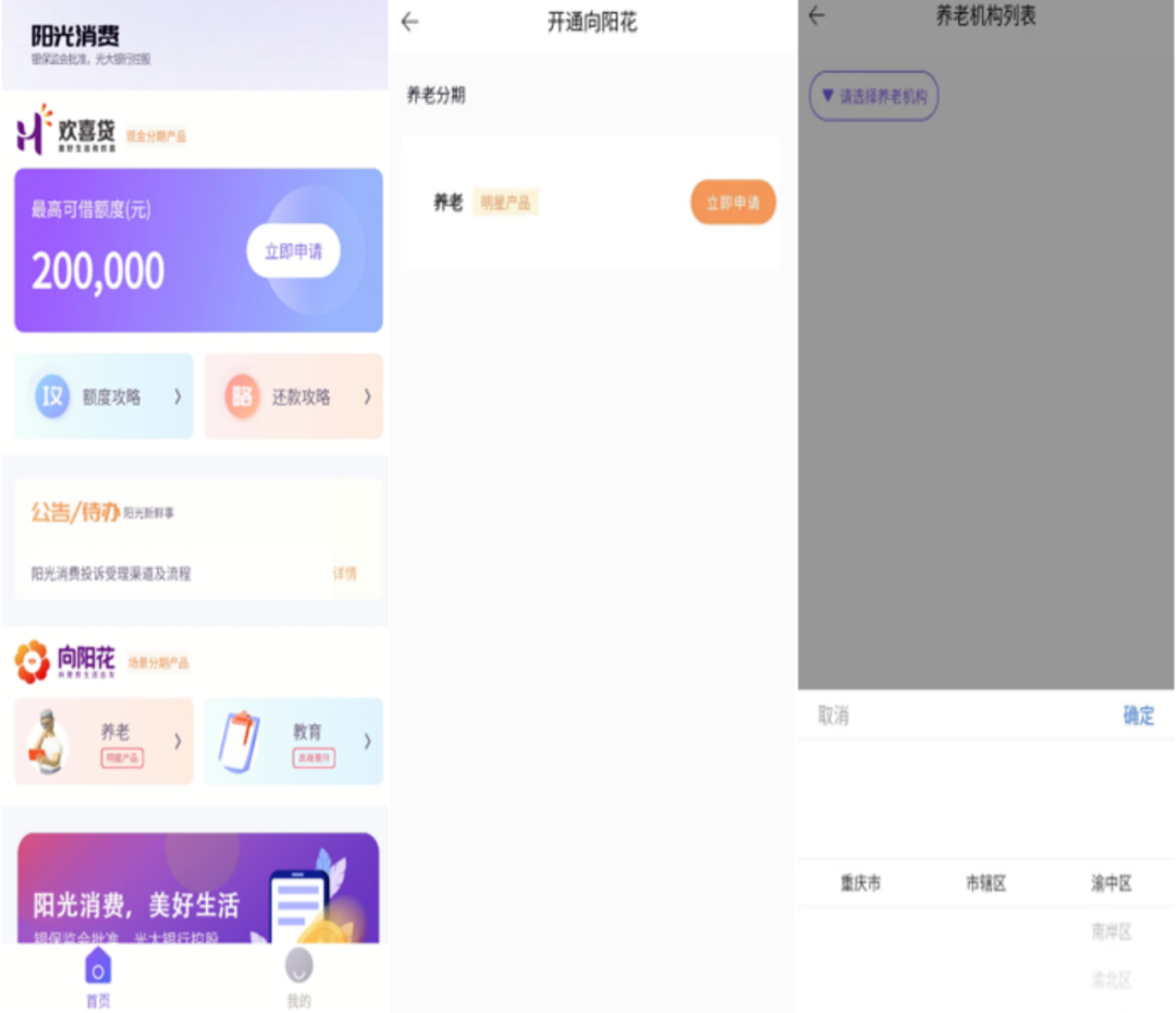 同樣,在該產(chǎn)品的利率披露上,陽(yáng)光消費(fèi)金融也未能按要求公示利率。此外,在養(yǎng)老機(jī)構(gòu)方面,陽(yáng)光消費(fèi)金融APP頁(yè)面顯示,用戶可通過(guò)“養(yǎng)老(明星產(chǎn)品)”進(jìn)行申請(qǐng),選擇養(yǎng)老機(jī)構(gòu),但目前僅向重慶市的渝中區(qū)、南岸區(qū)、渝北區(qū)的共六家養(yǎng)老機(jī)構(gòu)開放。此前2021年5月,陽(yáng)光消費(fèi)金融APP界面顯示,其覆蓋地區(qū)還包括北京、上海、天津、河北、山西等多個(gè)地區(qū),對(duì)此,陽(yáng)光消費(fèi)金融客服人員表示后續(xù)會(huì)陸續(xù)對(duì)其他省份開放該產(chǎn)品,并增加其他針對(duì)日常消費(fèi)的場(chǎng)景分期產(chǎn)品。