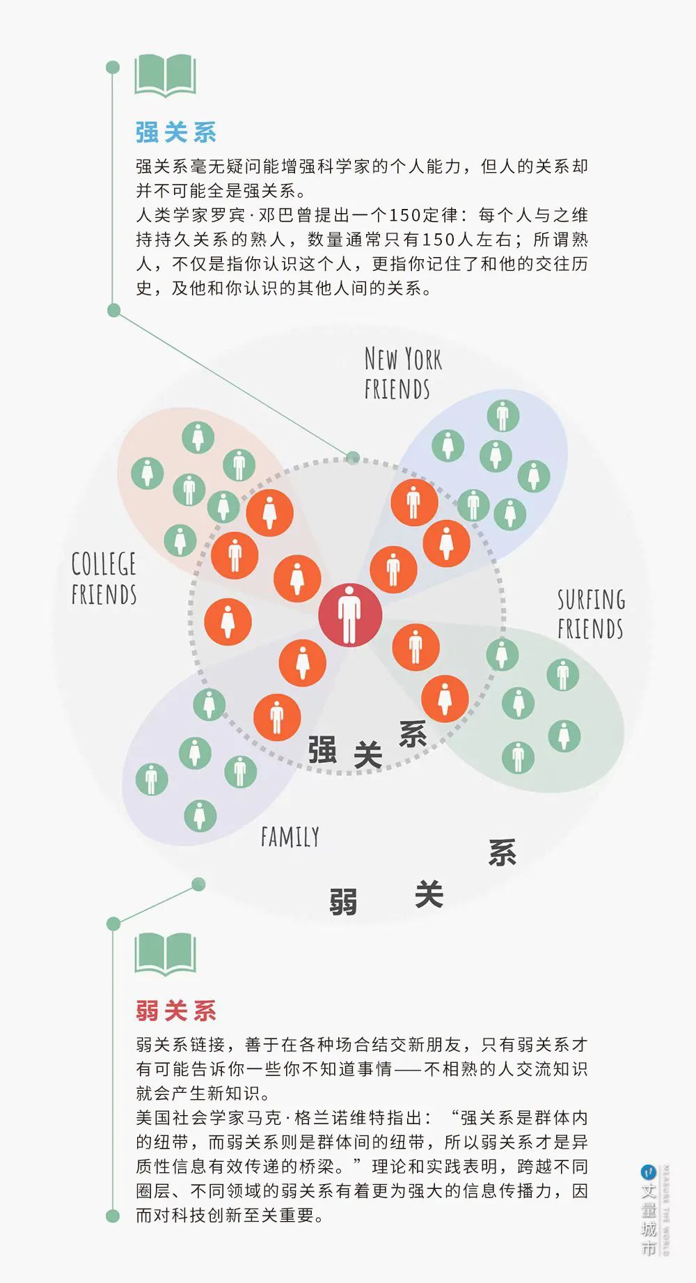 而更重要的是,在城市中心可以見到更多、更多元的人——這對于科學(xué)家的「跨界交流」實(shí)在太重要了。可以說,城市中心具有構(gòu)成「跨界交流」的先天優(yōu)勢——容易形成「弱關(guān)系」網(wǎng)絡(luò)。那么什么是「弱關(guān)系」?