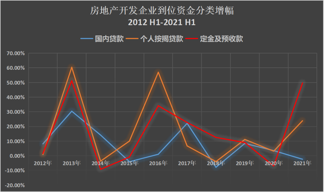 重點看國內(nèi)貸款、定金及預(yù)收款、個人按揭貸款三項的增幅,2012年上半年到2021年上半年這十年的情況如下: