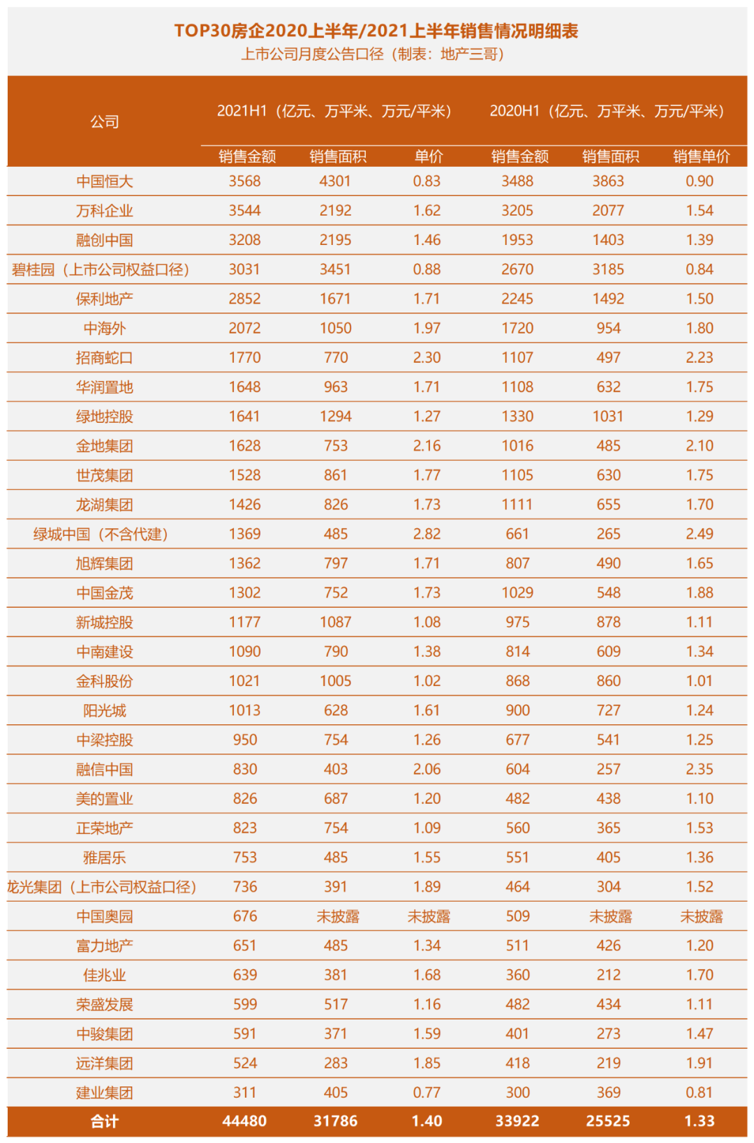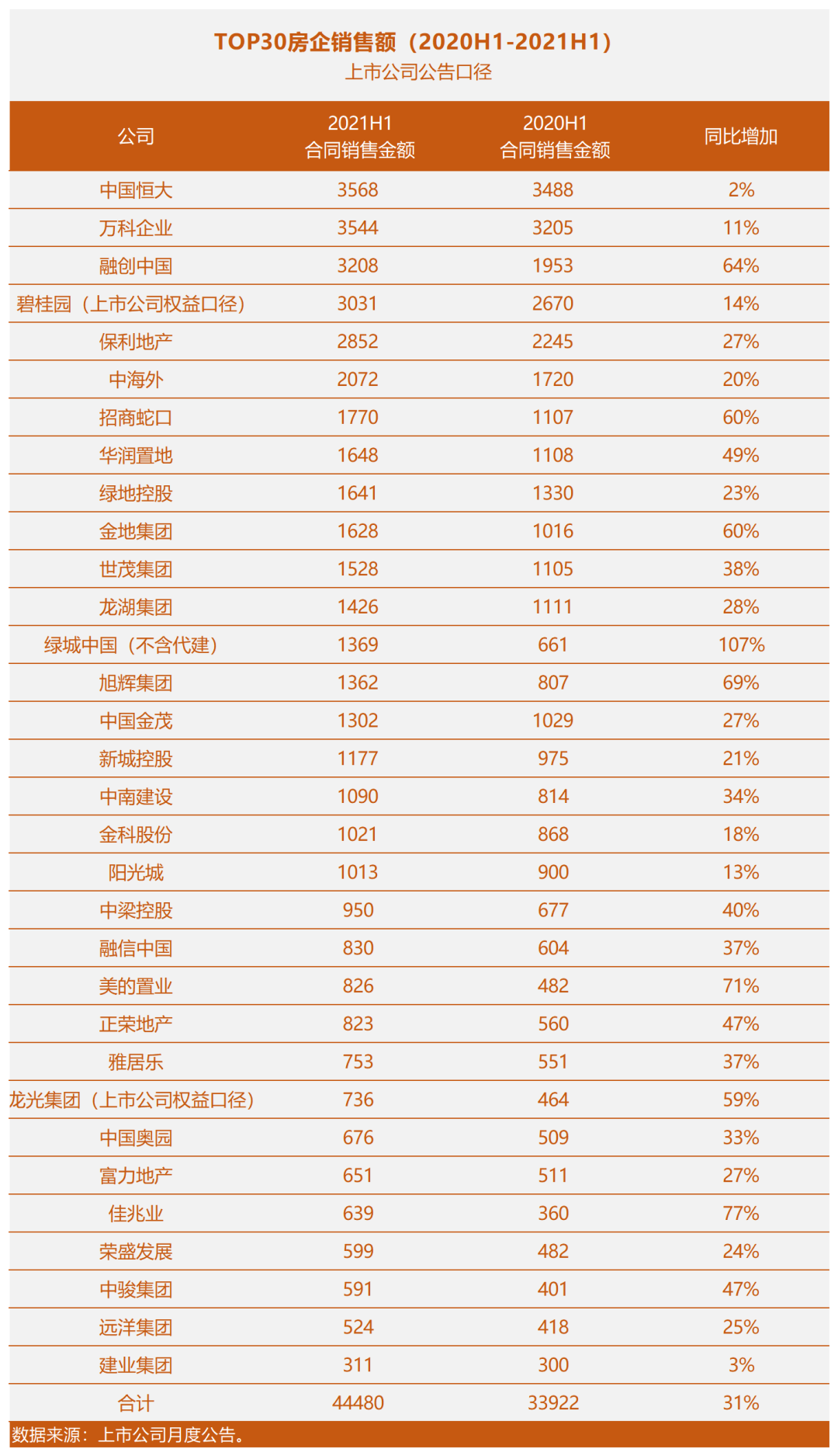 我們用上市房企月度公告口徑,對比了TOP30房企的銷售業(yè)績(2020年上半年與2021年上半年):