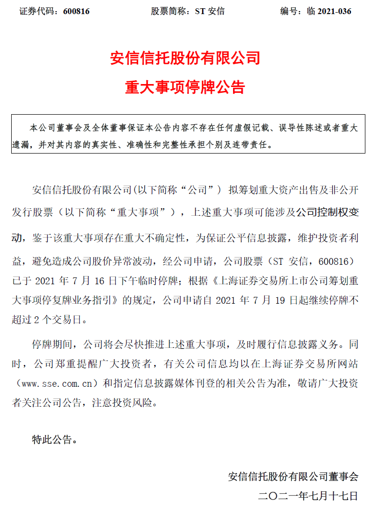 就在今天晚間的時(shí)候,ST安信發(fā)布公告稱:公司擬籌劃重大資產(chǎn)出售及非公開發(fā)行股票,該重大事項(xiàng)可能涉及公司控制權(quán)變動(dòng),鑒于該重大事項(xiàng)存在重大不確定性,為保證公平信息披露,維護(hù)投資者利益,避免造成公司股價(jià)異常波動(dòng),經(jīng)公司申請(qǐng),公司股票已于2021年7月16日下午臨時(shí)停牌;公司申請(qǐng)自2021年7月19日起繼續(xù)停牌不超過(guò)2個(gè)交易日。停牌期間,公司將會(huì)盡快推進(jìn)上述重大事項(xiàng),及時(shí)履行信息披露義務(wù)。同時(shí),鄭重提醒廣大投資者,有關(guān)公司信息均以上海證券交易所和指定的信息披露媒體刊登的相關(guān)公告為準(zhǔn),敬請(qǐng)廣大投資者關(guān)注公司公告,注意投資風(fēng)險(xiǎn)。看到這里不得不感嘆,安信信托重組總算有了實(shí)質(zhì)性的進(jìn)展,雖然還有很長(zhǎng)很長(zhǎng)的路要走。于是馬不停蹄地打開電腦,寫下這篇文章。二.有跡可循的重組