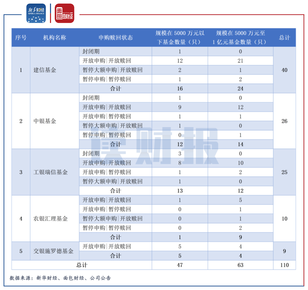 截至2022年2月7日收盤,五大行旗下基金公司共有110只產品資產凈值小于1億元,其中規模不足5000萬元的有43只、規模在5000萬元至1億元的有63只。從單家機構來看,建信基金的產品數量最多,達到40只;其次為中銀基金、工銀瑞信,分別為26只、25只。