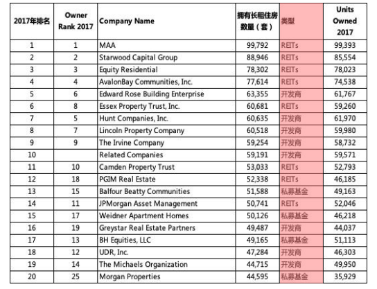 從模式看,數(shù)據(jù)顯示,美國2017年擁有長租住房數(shù)量排名前20的住房租賃企業(yè)具有以下特點:住房租賃企業(yè)以REITs和開發(fā)商為主, 前20的企業(yè)均為重資產(chǎn)運營商。