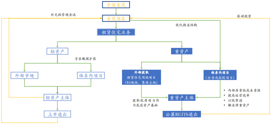 如何輕重結(jié)合?以金茂為例,公寓業(yè)態(tài)優(yōu)先尋求規(guī)模擴張,夯實底層重資產(chǎn)基礎(chǔ),并在形成現(xiàn)金流的基礎(chǔ)上,提升體系內(nèi)滯重資產(chǎn)的運營效率,并將滿足條件的體系內(nèi)自持部分裝入重資產(chǎn)主體,構(gòu)建公募REITs底層資產(chǎn), 打通投融管退全生命周期。