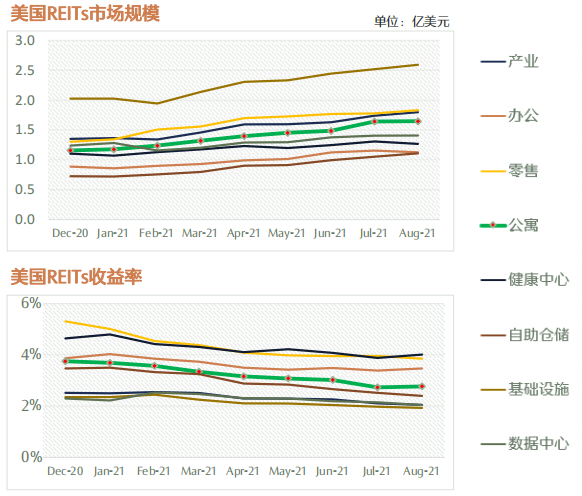 從2013年至今美國各類資產(chǎn)資本化率走勢來看,單看美國REITs市場規(guī)模和收益率走勢,除了IDC、物流資產(chǎn)之外,投資人對長租公寓的投資一直處于上升趨勢。
