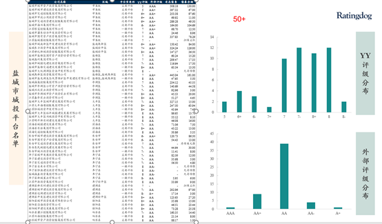 從平臺(tái)分布來(lái)看,確實(shí)是比較多。總體平臺(tái)數(shù)量有50來(lái)個(gè),區(qū)縣級(jí)普遍超過(guò)3個(gè),級(jí)別高度下沉。從外評(píng)來(lái)看,集中在AA;從YY評(píng)級(jí)來(lái)看,在7、7-、8+和8這四檔,有點(diǎn)厚尾,顯著右偏,投機(jī)級(jí)占比比較高,平臺(tái)確實(shí)是需要一定的整合。