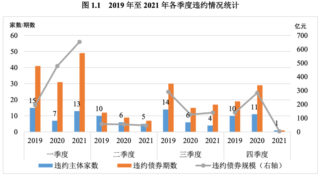 2021年,我國債券市場新增23家違約[1]發行人(詳見表1.1),共涉及到期違約債券[2]87期,到期違約金額[3]約1,015.76億元,新增違約發行人家數、涉及到期違約債券期數較2020年(31家、98期)和2019年(49家、140期)有所減少,但違約規模較2020年(1,019.36億元)和2019年(914.50)變化不大,仍維持在較高水平,清償處置壓力依然較大。