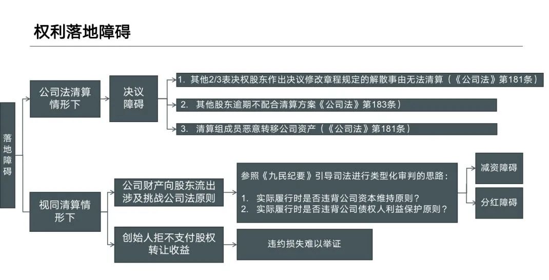 但是,同上文探討一票否決權落地效果的邏輯一致,在探究完畢其條款法律效力現(xiàn)狀后,我們仍然進一步總結了目前優(yōu)先清算權實現(xiàn)過程中存在的實際障礙與可能的救濟路徑: