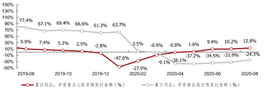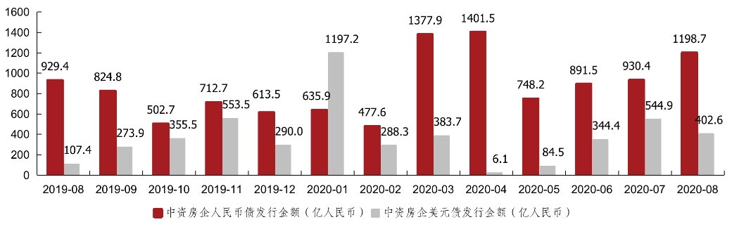 2020年8月,中資房企美元債發行金額為58.1億美元,相當于402.6億元人民幣,同比上升274.7%,環比下降26.1%;人民幣債發行金額為1198.7億人民幣,同比上升29.0%、環比上升28.8%。