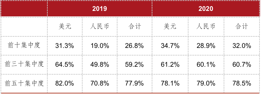 2020年前8月,前十發債集中度提升,人民幣債加權票息下降明顯。與銷售業績集中度提升的方向一致,資金向頭部房企集中以規避中小房企在調控中存在的各類不確定性風險。