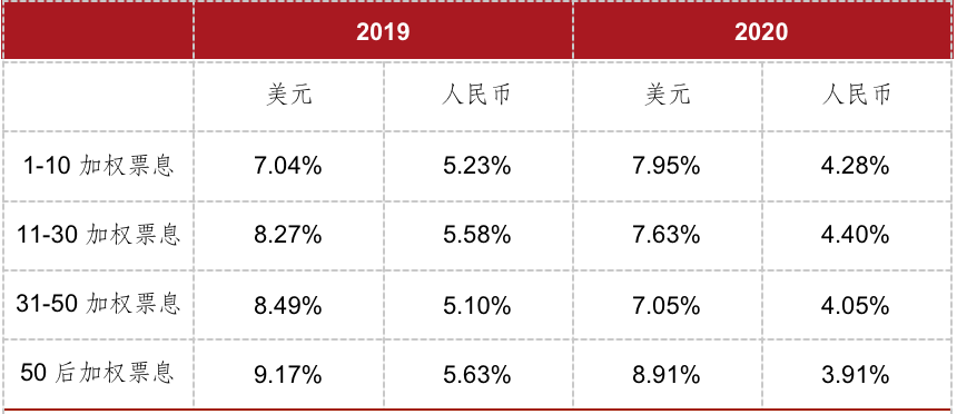 表2:2019年及2020前8月加權票息