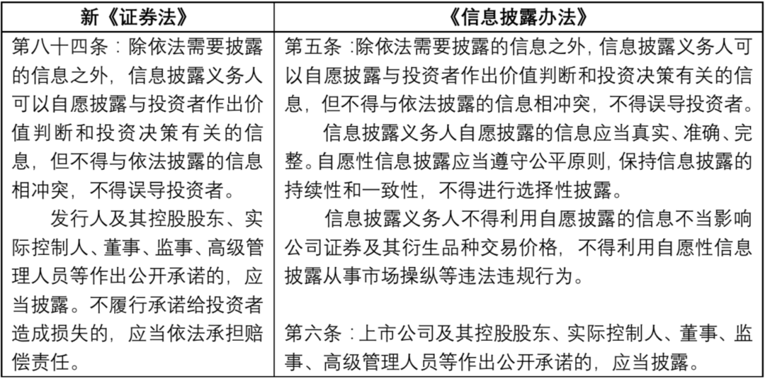 公開(kāi)承諾披露是對(duì)自愿披露的限制,一旦公開(kāi)承諾,該承諾內(nèi)容便成為特殊的強(qiáng)制披露內(nèi)容,不再屬于自愿披露內(nèi)容。[9]由此新《證券法》第八十四條第二款和《信息披露辦法》第六款新增了公開(kāi)承諾披露制度。承諾人不履行承諾給投資者造成損失的,依法承擔(dān)賠償責(zé)任。
