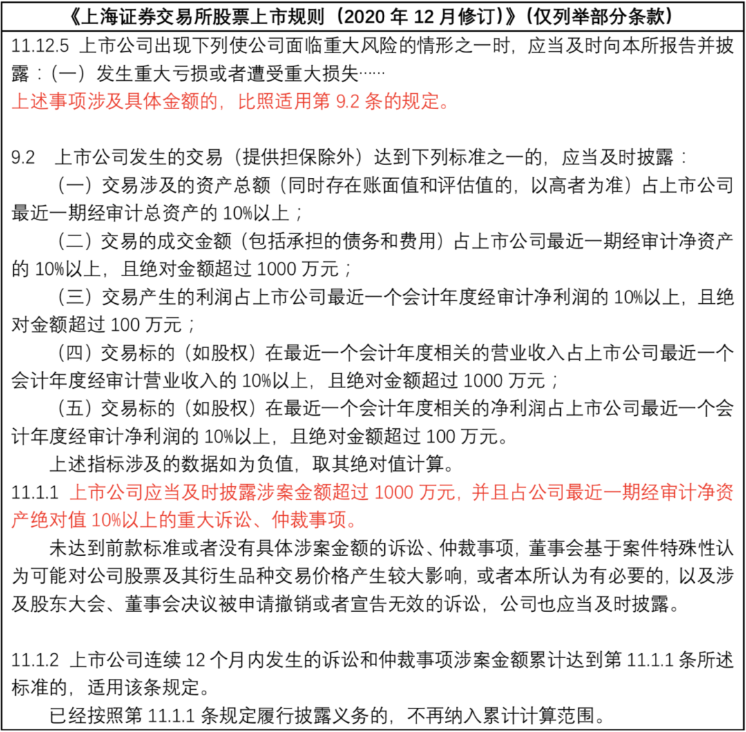 對(duì)于公司發(fā)生重大債務(wù)和未能清償?shù)狡谥卮髠鶆?wù)的違約情況、涉及重大訴訟或仲裁等具體達(dá)到何種金額才能構(gòu)成重大事件應(yīng)當(dāng)予以披露,交易所的相關(guān)規(guī)則有明確規(guī)定,以《上海證券交易所股票上市規(guī)則(2020年12月修訂)》為例: