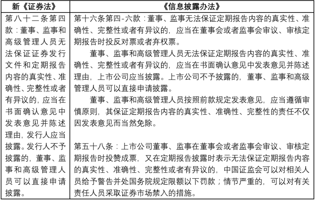 考慮到發(fā)行人董監(jiān)高較高的職業(yè)風(fēng)險(xiǎn)和權(quán)限范圍,基于保障董監(jiān)高合法權(quán)益,新《證券法》第八十二條第四款,在《上市公司信息披露管理辦法(2007年)》第二十四條第二款等規(guī)定基礎(chǔ)之上,新增了董監(jiān)高的信息披露異議制度,即董監(jiān)高在無(wú)法保證發(fā)行文件和定期報(bào)告內(nèi)容真實(shí)、準(zhǔn)確、完整或存在異議時(shí),應(yīng)當(dāng)書(shū)面確認(rèn)意見(jiàn)并陳述理由,發(fā)行人應(yīng)予披露,發(fā)行人不披露的,董監(jiān)高可申請(qǐng)披露。董監(jiān)高異議披露制度也是發(fā)現(xiàn)證券市場(chǎng)虛假陳述等違法行為的有效措施之一。[12]