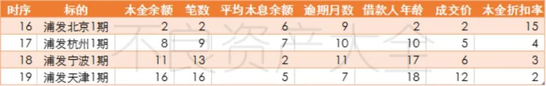 本月19-20日兩天,浦發銀行接連售出4期個貸不良資產,共87戶207筆,總計未償本金約1,828萬元,賬齡介于2-3年之間,件均(本息合計)10萬元左右,均為消費貸,區域分別為京杭甬津,處置狀態除了天津1期的一部分標的均已起訴,大部分終本或執行終結。